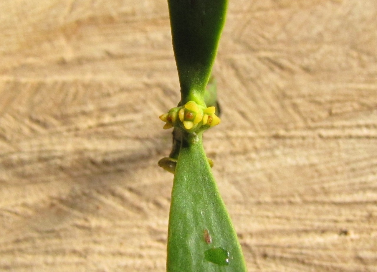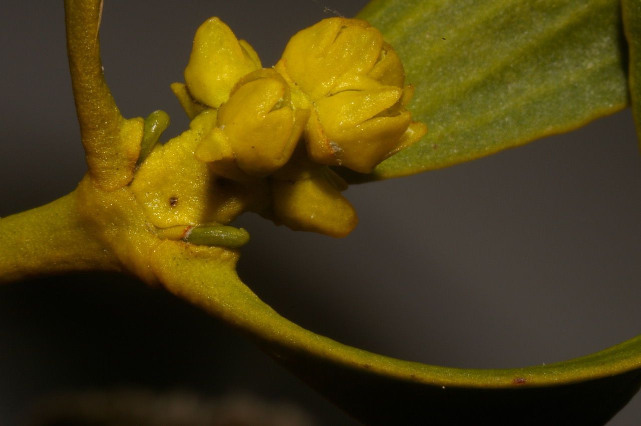 Ce petit arbre persistant est haut de 3 à 10 mètres avec une écorce d’abord verte, puis gris jaunâtre, peu gerçurée. Sa seconde écorce produit de la glu.