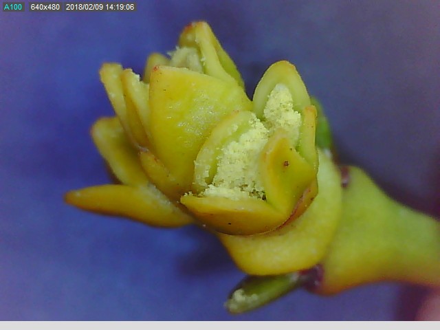 Ses feuilles épaisses, charnues d’un vert jaunâtre, à 5-6 nervures parallèles sont opposées par deux.