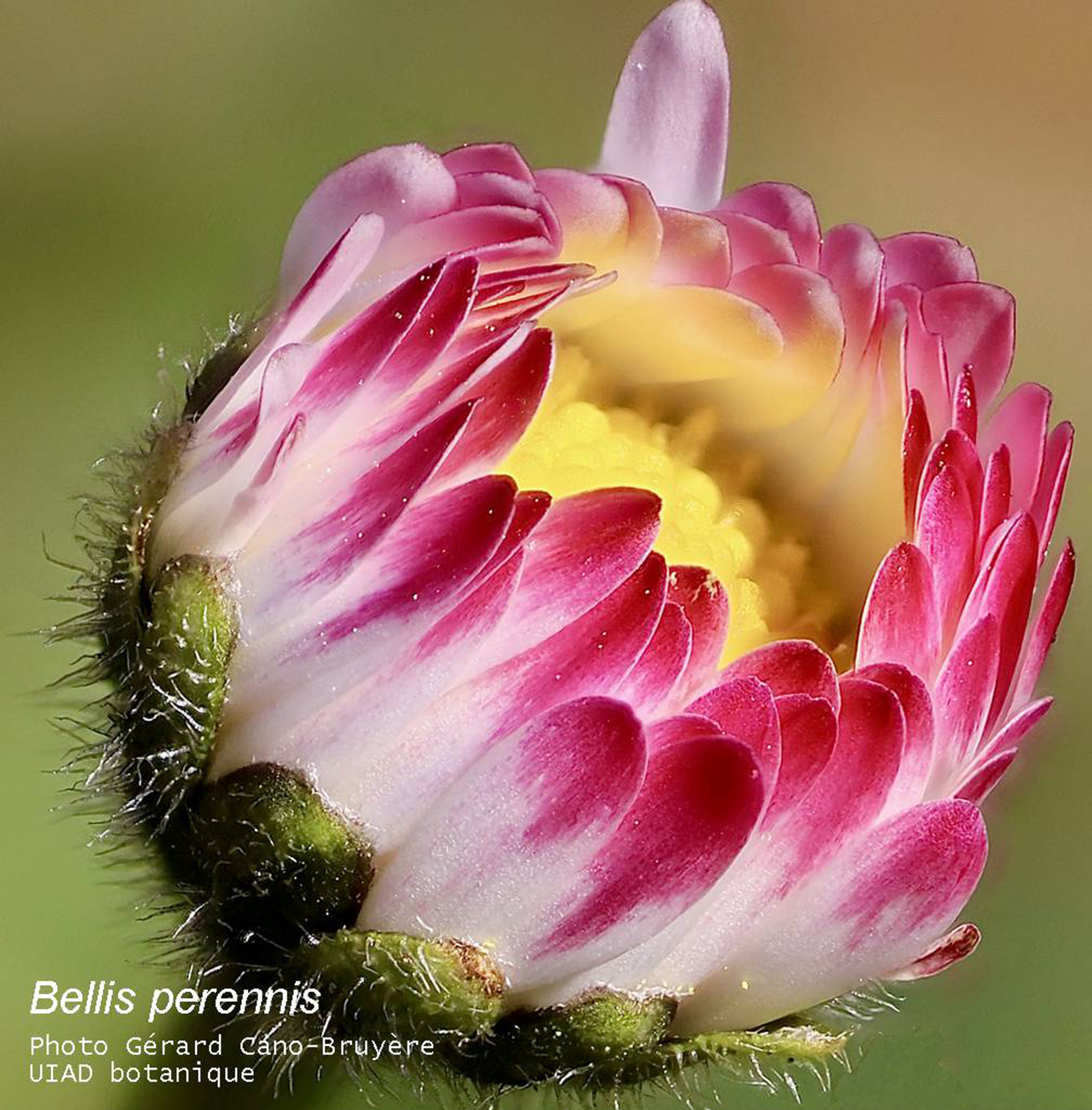 Plante vivace, gazonnante, de 5-20 cm de hauteur poussant en touffes denses. Les feuilles sont disposées en rosettes basales. Le limbe, entier ou crénelé, est marqué par une nervure longitudinale unique bien visible. La tige est couverte de petits poils portant une fleur blanche qui est en réalité un capitule comprenant des fleurs en tubes jaunes au centre et des fleurs ligulées (en forme de languette) blanches teintées de rouge sur le pourtour.