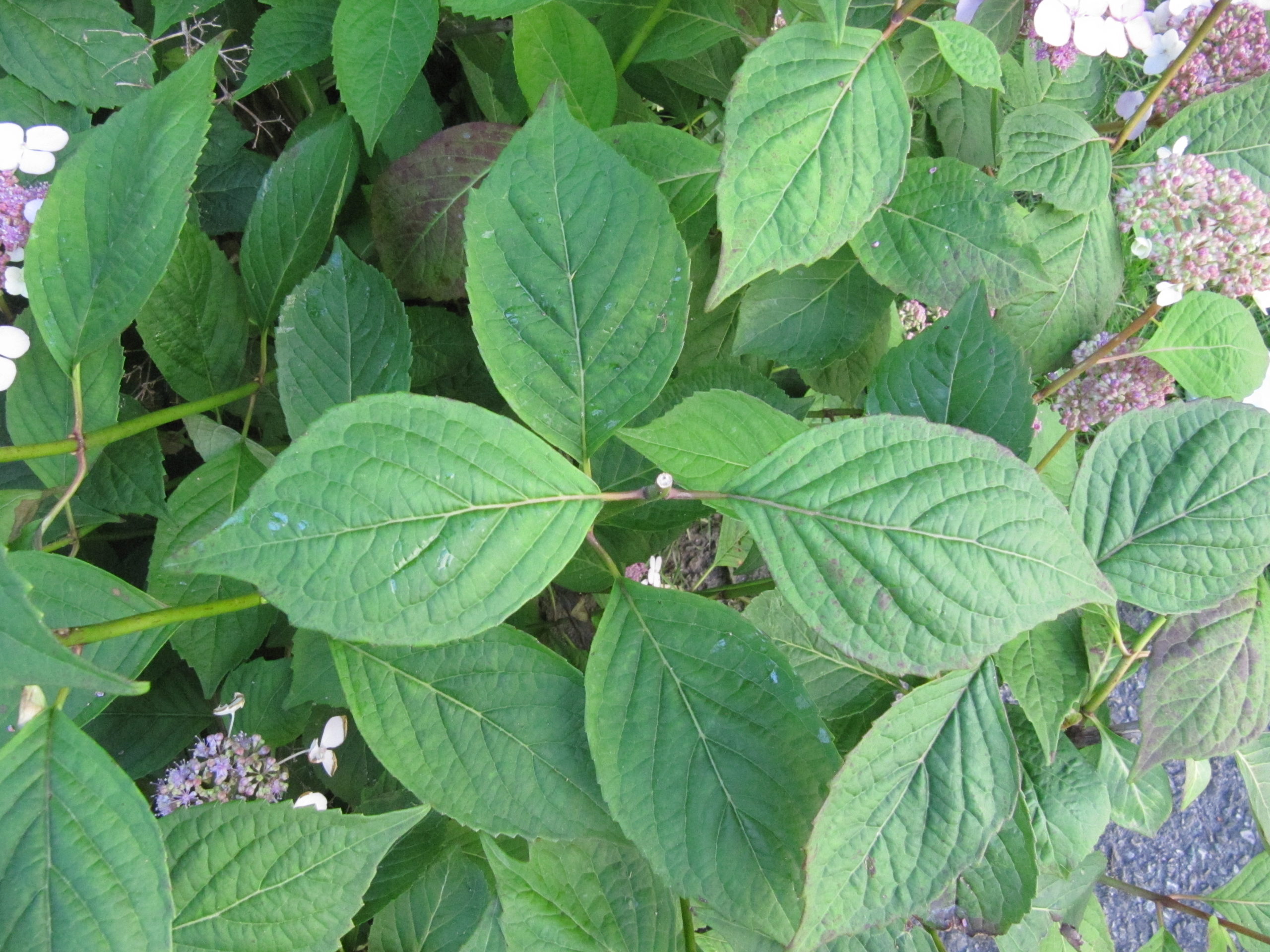 Les feuilles simples, dentées peuvent atteindre une quinzaine de centimètres de longueur d’où le terme macrophylla, du grec makros « grand » et phyllon (feuilles).