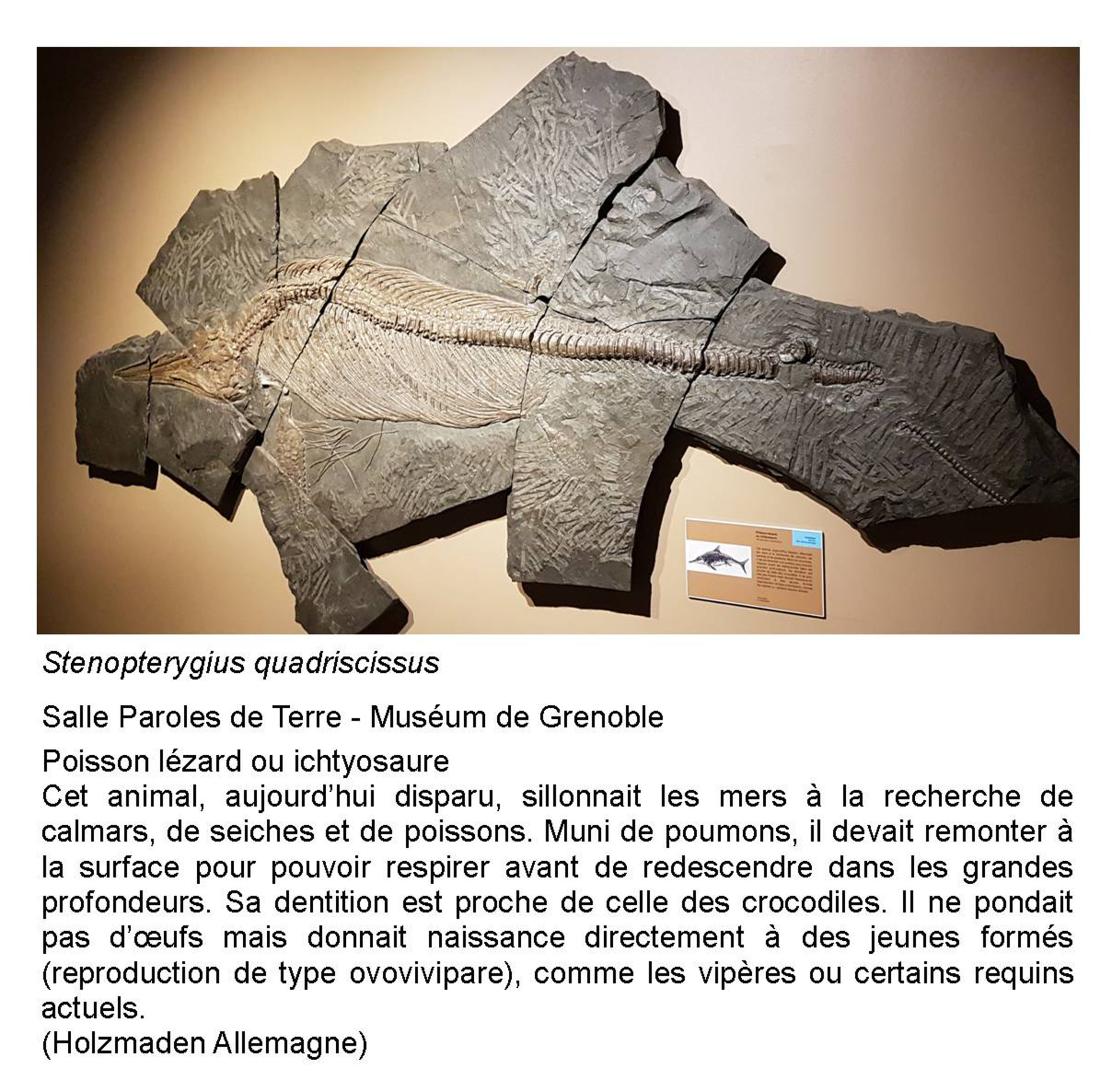 Les Ichtyosaures du Jurassique ressemblaient de par leur forme au dauphin actuel qui est un mammifère. Les plus anciens, connus du Trias inférieur, avaient la forme d’une anguille et nageaient, probablement, par ondulation de leur corps. Avec le temps ils acquirent un corps plus profilé ainsi que de vraies palettes natatoires pour, au jurassique, ressembler, tel ce Stenopterygius quadriscissus, au dauphin actuel.